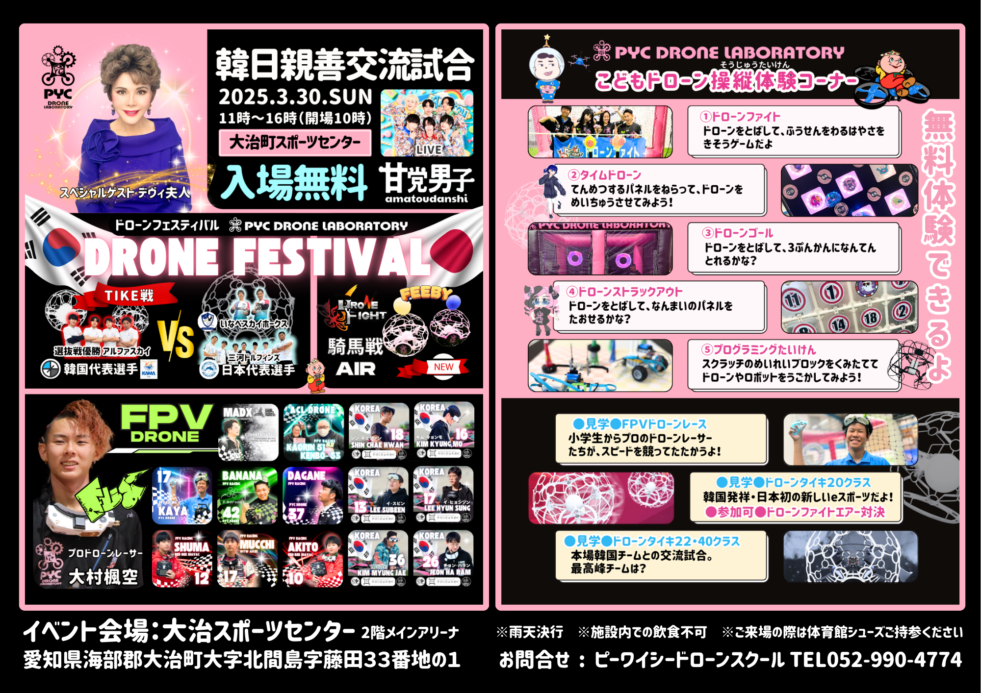 ◆国土交通省 登録講習機関 ・国家資格取得(一等・二等) ◆ドローンスポーツ全般 ・FAI公式 FPVドローンレース ・F9A-A*F9A-B DRONE TIKE ◆HELSEL日本正規代理店 ・教育用ドローン ・農業用ドローン ・その他ドローンシステム等 ◆FPVドローンスクール PYC名古屋校 ・FPV専門コース ◆韓国留学教育 (ドローン体験学習/FAI KAMA 代理申請/DFL) ◆一社)ドローンファイト協会 ・ドローンファイトAir 名古屋支部 ◆ロボキューブ中川教室 ◆出張イベント/空撮 ◆美容サロン(予約制) |